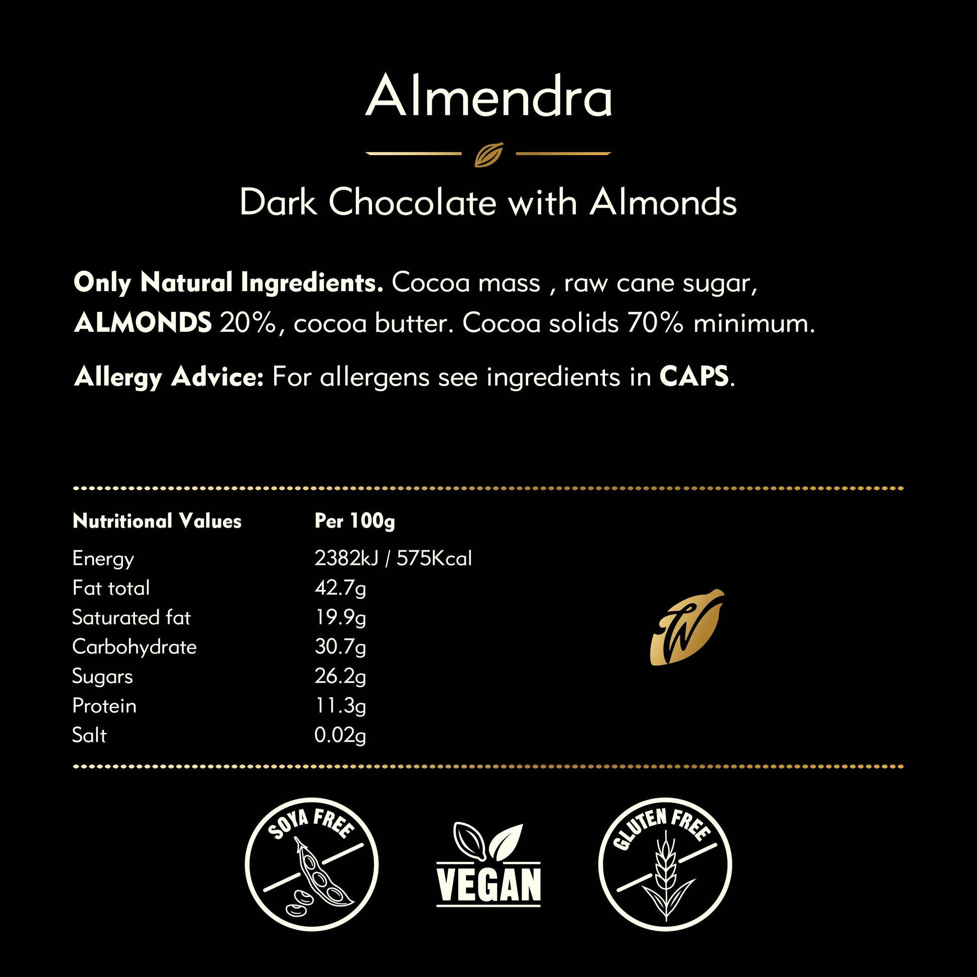 Almendra. Dark chocolate with almonds. Vegan. 50g bar